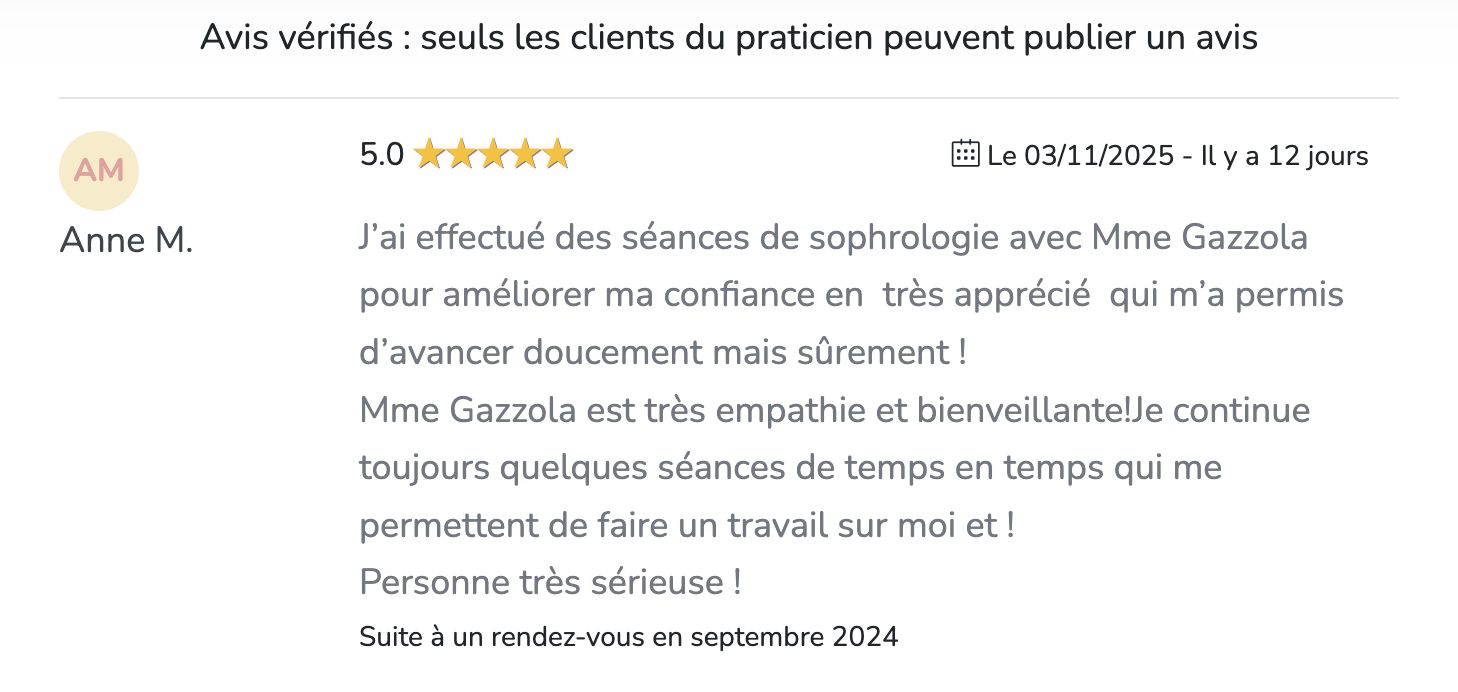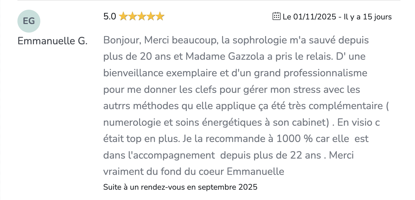 Je reçois la personne dans mon cabinet à Nailloux (31), par téléphone et en visio.